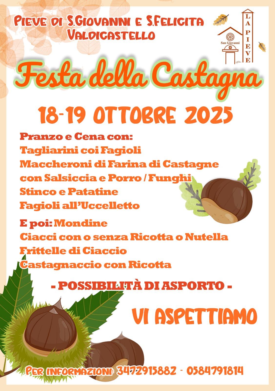 PIEVE DI S.GIOVANNI E S.FELICITAVALDICASTELLOLA PIEVEFesta della Castagna18-19 OTTOBRE 2025Pranzo e Cena con:Tagliarini coi FagioliMaccheroni di Farina di Castagnecon Salsiccia e Porro/FunghiStinco e PatatineFagioli all'UccellettoE poi: MondineCiacci con o senza Ricotta o NutellaFrittelle di CiaccioCastagnaccio con Ricotta- POSSIBILITÀ DI ASPORTO -VI ASPETTIAMOPER INFORMAZIONI 3472915882-0584791814
