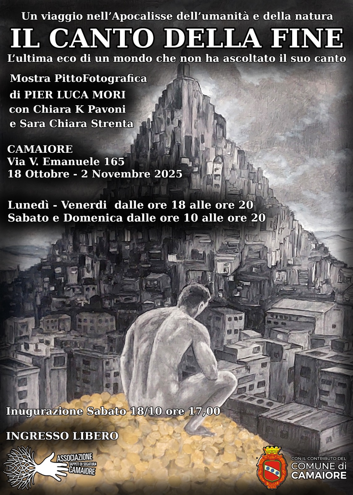 Un viaggio nell'Apocalisse dell'umanità e della naturaIL CANTO DELLA FINEL'ultima eco di un mondo che non ha ascoltato il suo cantoMostra PittoFotografica di PIER LUCA MORI con Chiara K Pavoni e Sara Chiara StrentaCAMAIORE Via V. Emanuele 165 18 Ottobre - 2 Novembre 2025Lunedì - Venerdi dalle ore 18 alle ore 20 Sabato e Domenica dalle ore 10 alle ore 20Inugurazione Sabato 18/10 ore 17,00INGRESSO LIBEROASSOCIAZIONE CAMAIORE TAPPETI DI SEGATURACON IL CONTRIBUTO DEL COMUNE di CAMAIORE
